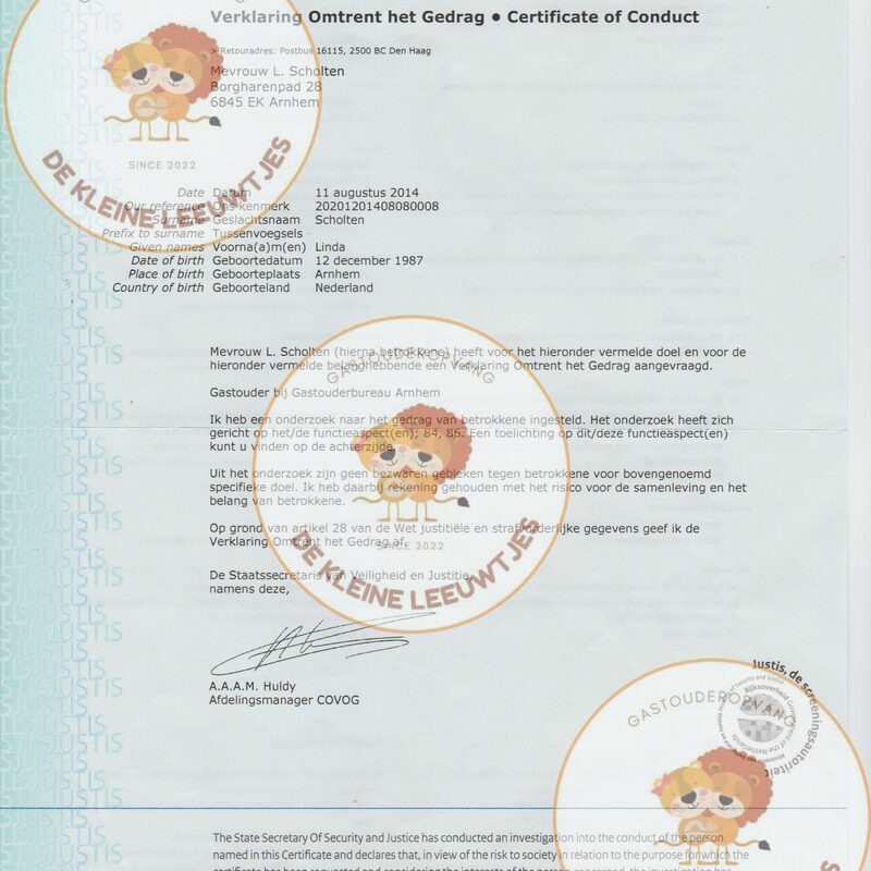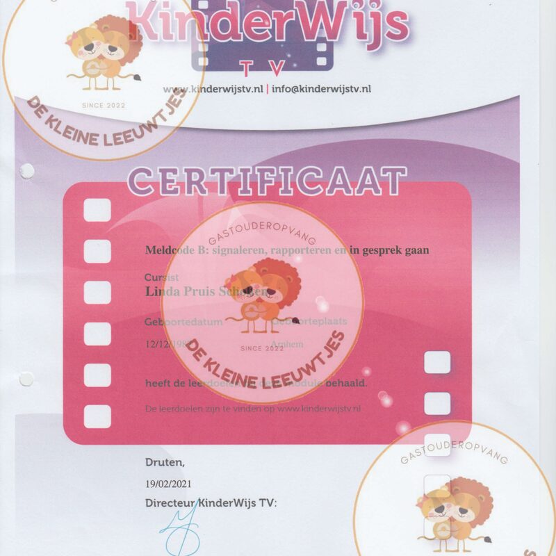- Certificaat omgaan met (vermoedens) van kindermishandeling, behaald op 19.02.2021.