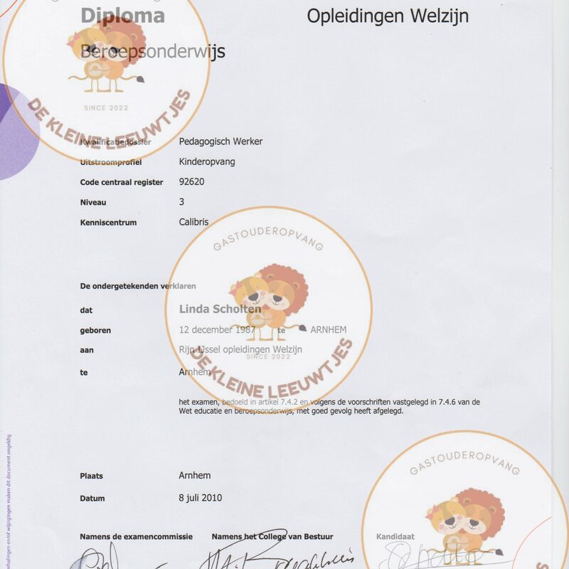 - Pedagogisch Werker, niveau 3, behaald op 08.07.2010.